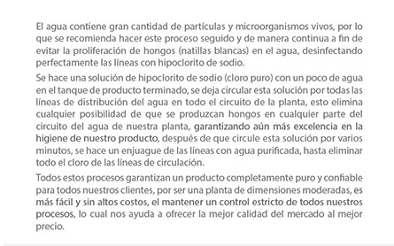 El agua, pasa por el Carbón Activado. El Carbón Activado ha sido seleccionado considerando las características fisicoquímicas del agua, obteniendo eficiencia en la eliminación de cloro, sabores y olores, característicos del agua de pozo, así como también elimina una gran variedad de contaminantes químicos orgánicos categorizados como productos dañinos de origen "moderno" tales como: pesticidas, herbicidas, metilato de mercurio e hidrocarburos clorinados.